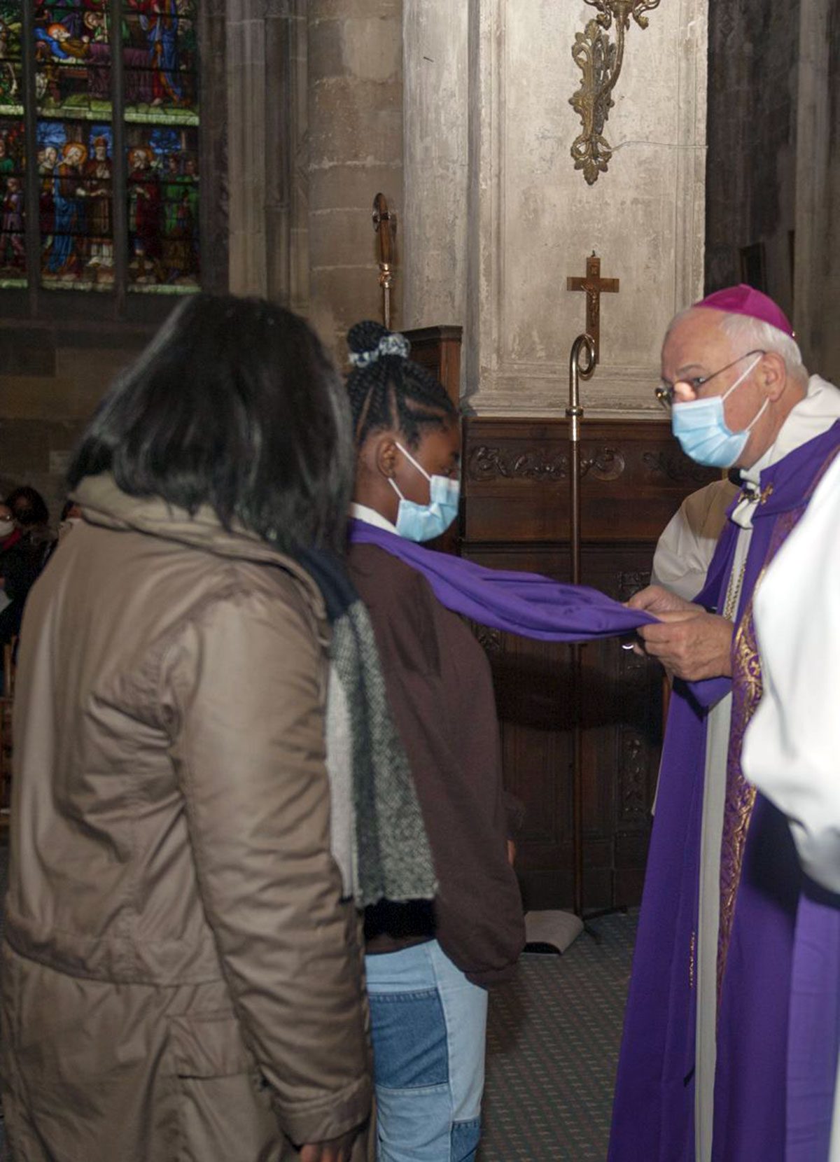 Je vous remettrai l’écharpe violette que vous porterez dans les célébrations durant ce carême. Elle est signe de l’existence qui est encore la vôtre. Cette écharpe violette, au moment du baptême, elle vous sera arrachée, en signe de la vie nouvelle dans laquelle vous entrerez, et vous serez revêtus d’un vêtement blanc, signe de la nouvelle naissance.