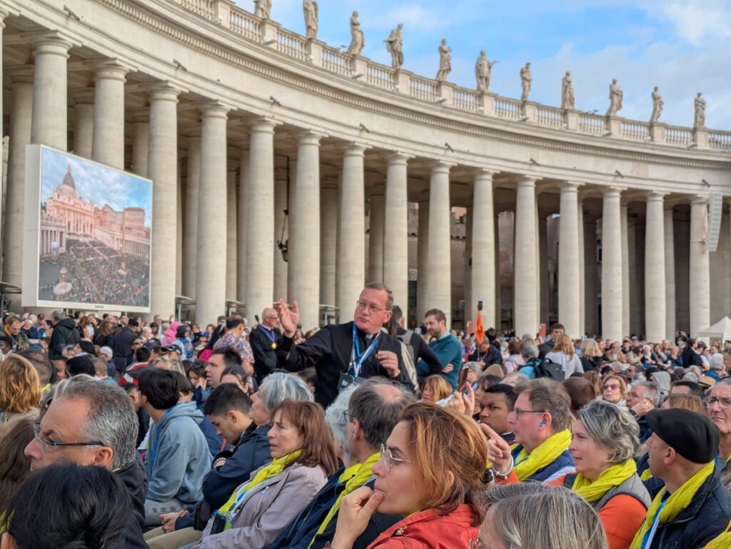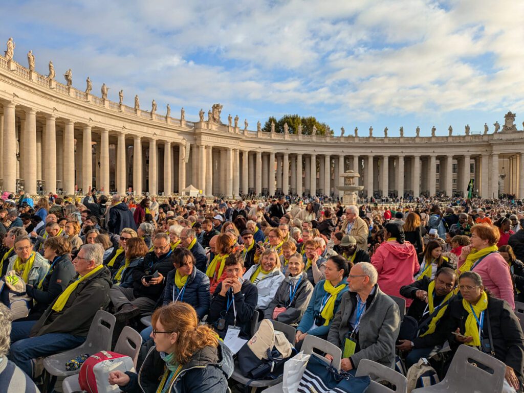Ce matin, malgré un ciel gris et une pluie fine, la place Saint-Pierre rayonne d’une joie profonde. Les 750 pèlerins du Val-d’Oise se sont levés tôt pour assister à l’audience pontificale : un moment attendu, vécu comme le cœur battant du pèlerinage.