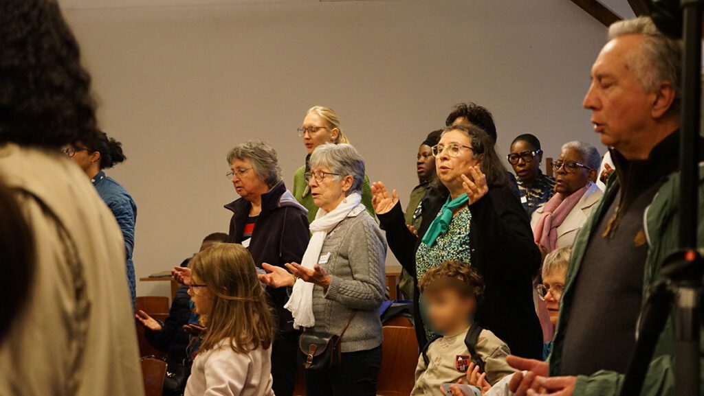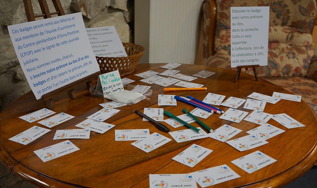 Cette journée fraternelle s’est aussi déroulée en union de prière avec les détenus de la Maison d’arrêt à Osny où l’espérance est un véritable défi. Tout au long de la rencontre, des badges portant les prénoms de détenus étaient proposés aux participants. Chacun était invité à choisir un prénom, à le porter dans la prière, et à inscrire le sien au dos du badge. Ainsi, une véritable chaîne de prière s’est tissée, reliant les cœurs des pèlerins de Pierrelaye à ceux des détenus, dans un échange discret mais puissant de foi, de soutien et d’humanité.