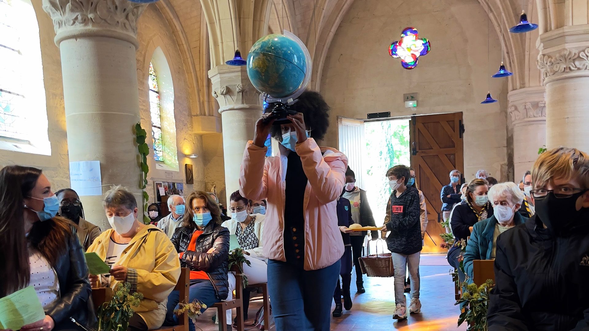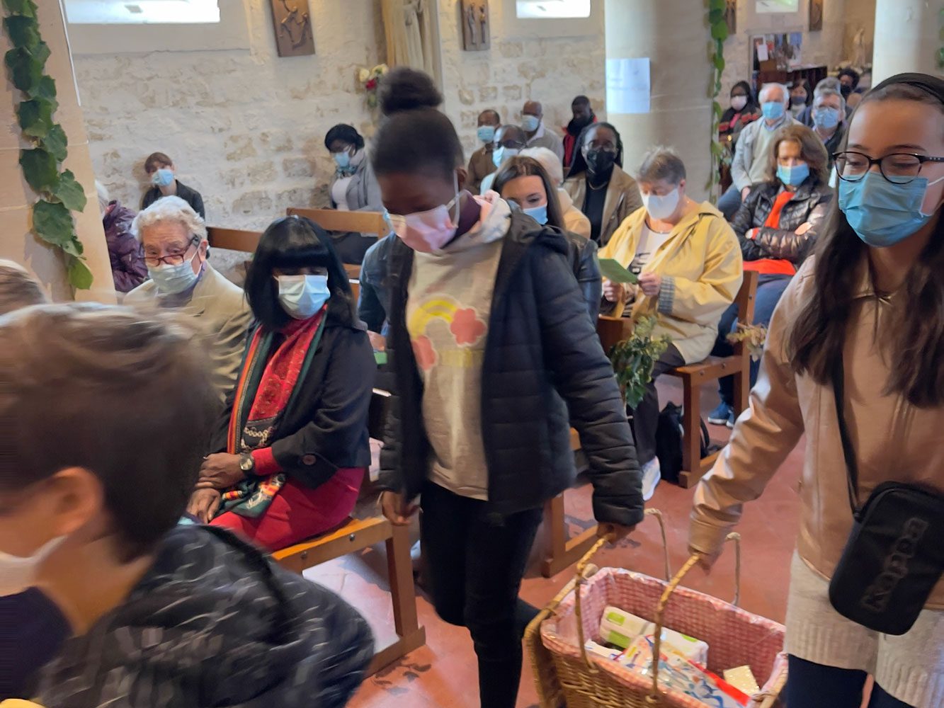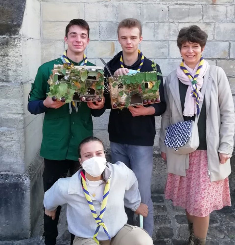 Dès 10h, les jeunes de l’aumônerie avec leurs animatrices ont fait entrer la nature dans l’église, en la décorant de branches et de fleurs fraîchement cueillies dans la rosée du matin. Les scouts les ont rejoints apportant dessins et petites maisons vertes réalisés la veille.