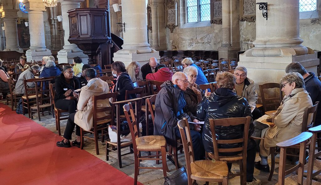 Quelle journée paisible dans cette belle église de Luzarches ! Quel accueil aussi des paroissiens qui ont pris soin de nous tout au long de la journée ! La joie aussi de retrouver des visages connus, des amis ! Une journée très bien équilibrée : méditation, seul ou à plusieurs, enseignement, marche silencieuse et méditative sous le soleil, partages entre pairs, magnifique eucharistie pour clore la journée ! OUI, après-coup, je peux témoigner : cette journée m’a vraiment nourrie et apaisée et vraiment je me serais privée de quelque chose de bon pour moi pensé et préparé avec soin par des organisateurs bienveillants ! Pour cette belle journée de pèlerinage et de ressourcement à Luzarches : MERCI ! »