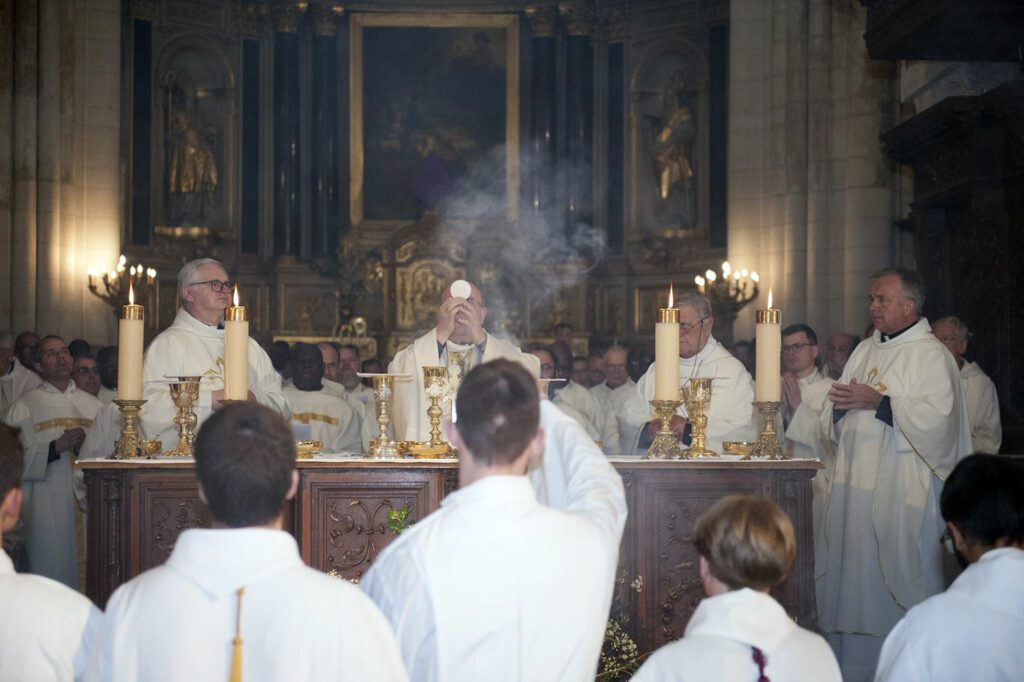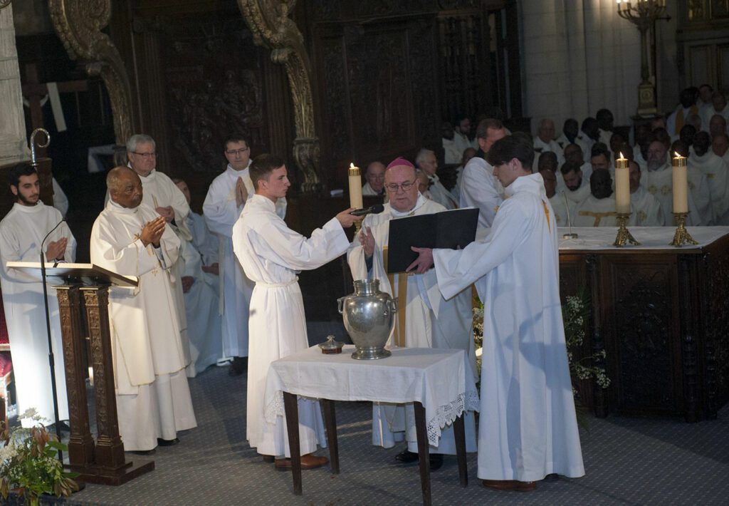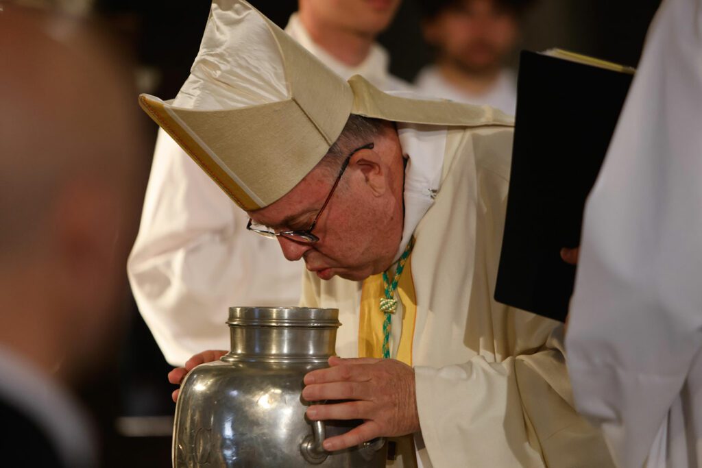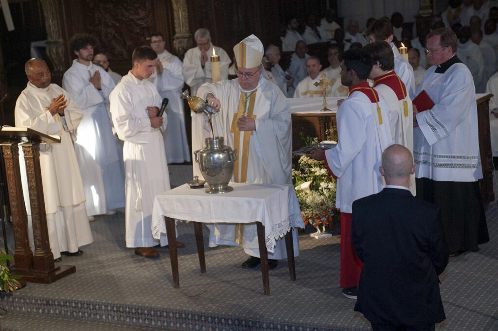 Moment central de la célébration : la bénédiction de l’huile des catéchumènes et de l’huile des malades et la consécration du Saint Chrême par Mgr Bertrand. Ces huiles seront utilisées tout au long de l’année dans les paroisses du Val-d’Oise pour les sacrements : baptême, confirmation, onction des malades et ordination.