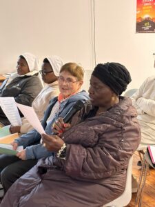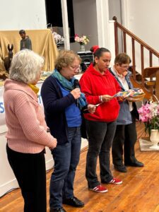 Trois témoignages sont ensuite venus nourrir la réflexion collective. Le premier a mis en lumière l’action du Secours catholique sur le secteur, notamment auprès des personnes exclues ou en situation de précarité, illustrant concrètement le partage à l’œuvre sur le terrain. Le second témoignage a souligné l’importance de l’amour et de la dignité retrouvée à travers l’engagement dans une association d’alphabétisation, où l’apprentissage de la langue devient un véritable levier d’intégration et de rencontre. Enfin, le troisième témoignage a évoqué la Paix au quotidien dans le quartier, avec un éclairage particulier sur la situation au Congo-Kinshasa, rappelant que les enjeux internationaux résonnent aussi dans nos vies locales.