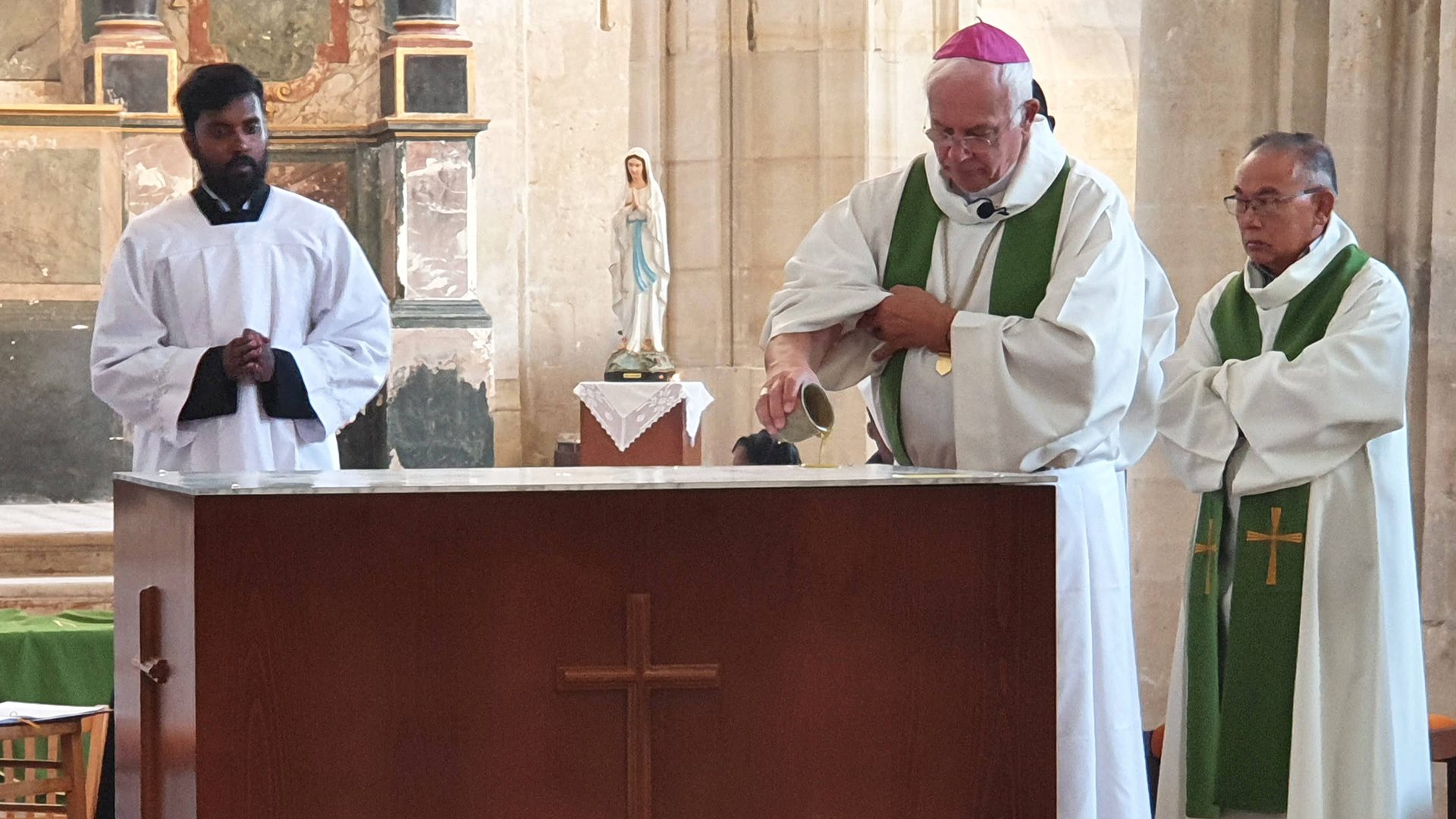 Entouré de la communauté paroissiale et des membres de la société civile, Mgr Stanislas Lalanne a procédé au rituel de la dédicace du nouvel autel réalisé par la maison Houssard mobilier : l’insertion des reliques, l’huile répandue sur l’autel, l’encens, les cierges allumés pour la première fois…
