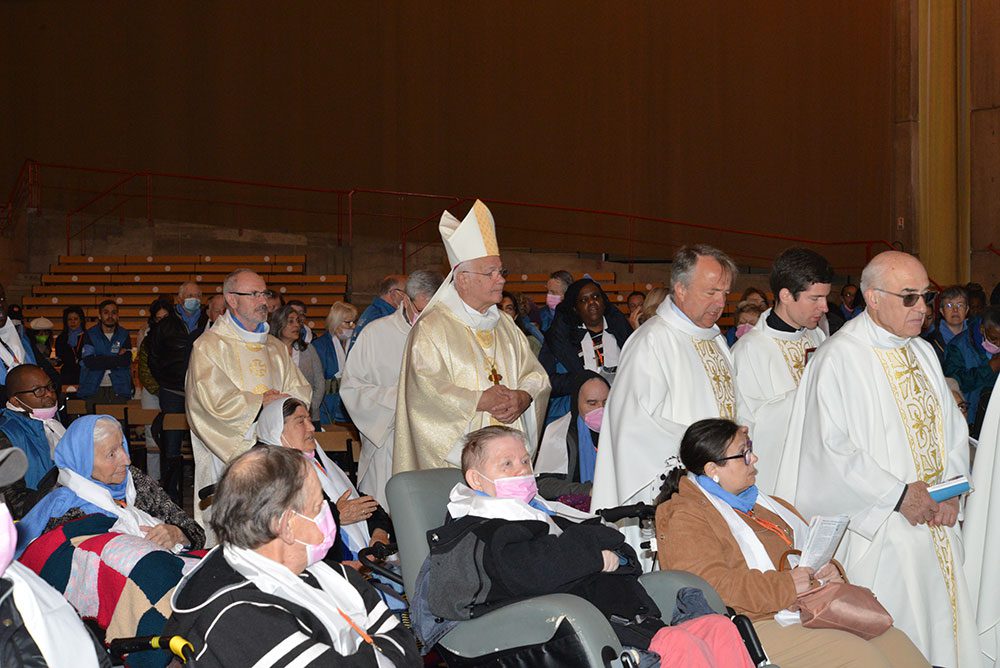 Dernière journée à Lourdes avant le retour vers le Val-d’Oise. Nous nous retrouvons pour participer à la messe d’envoi concélébrée par notre évêque et les prêtres présents. Après avoir béni l’eau, Mgr Lalanne asperge abondamment l’assemblée (y compris les appareils photo que je porte autour du cou !). Ensuite, dans un court enseignement, il rappelle la signification des gestes accomplis par le prêtre lors de l’onction des malades. Les prêtres se dirigent alors, vers celles et ceux qui ont demandé à recevoir ce sacrement. C’est un moment très intense où il est difficile de retenir ses larmes. Ce ne sont pas des larmes de tristesse ou de douleur, ce sont des larmes d’émotion et d’apaisement.