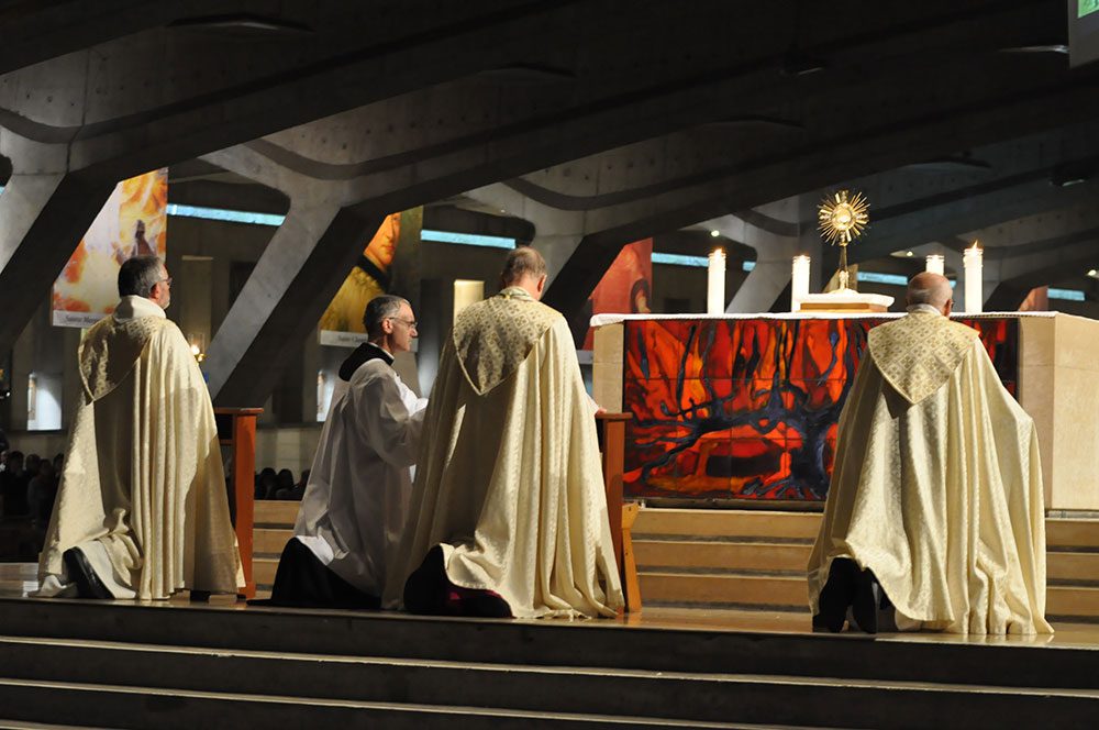 Troisième temps fort ? La procession eucharistique qui s’achève dans la basilique souterraine avec l’adoration du Saint Sacrement. Les jeux de lumière sur l’ostensoir renforcent la solennité de la célébration, là aussi toute simple mais d’une grande intensité.
