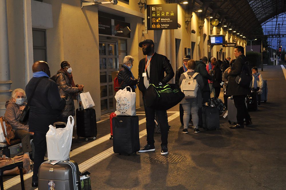 Le 3 mai 2022, gare Montparnasse, hall 2, 5h45. Le diocèse de Pontoise s’apprête à partir à Lourdes. Déjà les premiers pèlerins arrivent. Les corps sont debout, mais les cœurs et les esprits sont encore sous la couette. A cette heure matinale, il règne un silence impressionnant. Ceux qui sont déjà arrivés ne parlent pas, ils chuchotent, on a l’impression qu’ils ne veulent pas déranger. Chacun reçoit un petit sac à son nom, avec le livret du pèlerin, un chèche, un badge, bravo l’organisation. Puis l’ordre est passé, il faut embarquer. Le groupe se déplace, monte dans le T.G.V. s’installe, toujours dans un relatif silence.