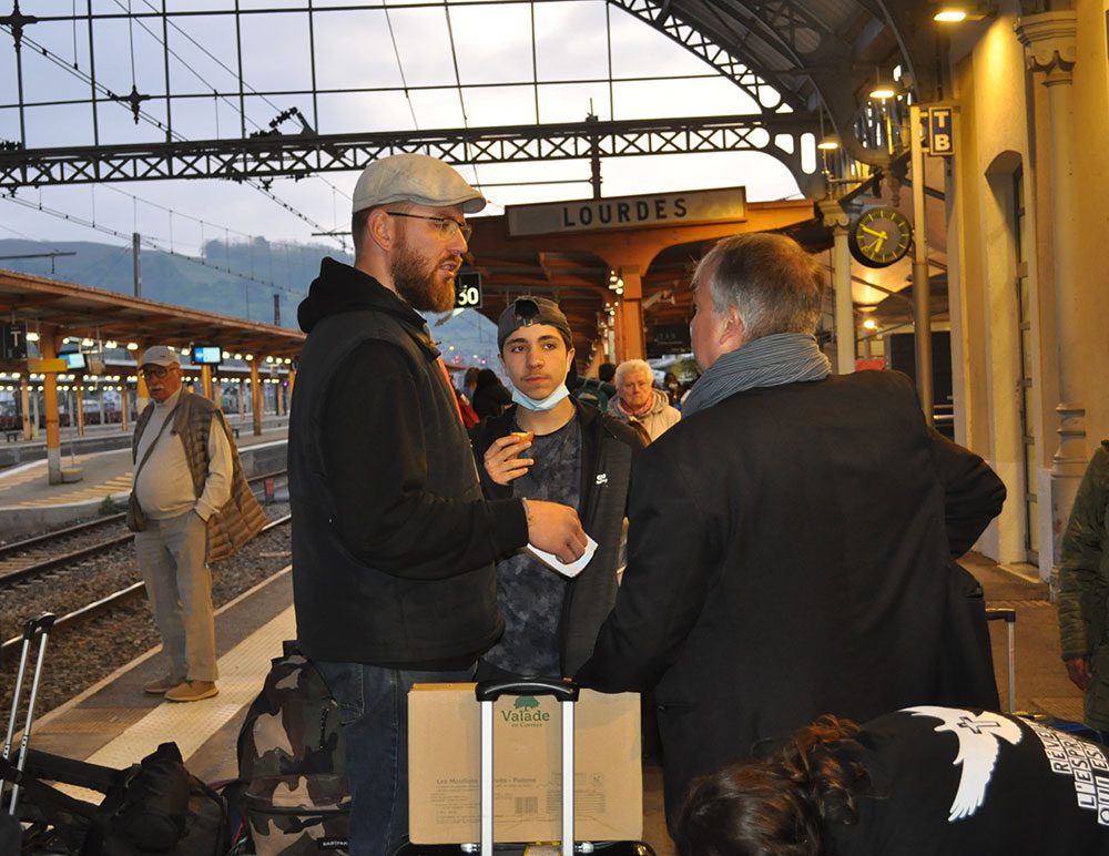 Le train démarre. Le voyage se passe sans problème. Nous arrivons à Lourdes, un trio de musiciens nous accueille en musique et mette de l’ambiance dans la gare, les jeunes depuis plus longtemps apprécient, les plus jeunes s’éclatent. Chacun part vers son lieu d’hébergement.