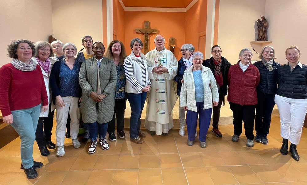 La messe, présidée par notre évêque, est célébrée dans la chapelle ; c’est l’occasion de quelques photos des diacres puis de leurs épouses autour de notre évêque.