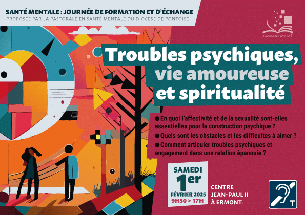 La Pastorale en santé mentale du diocèse de Pontoise propose une journée de formation et d’échanges sur le thème : « Troubles psychiques, vie amoureuse et spiritualité ». Samedi 1er février 2025 à Ermont. Ouvert à tous.