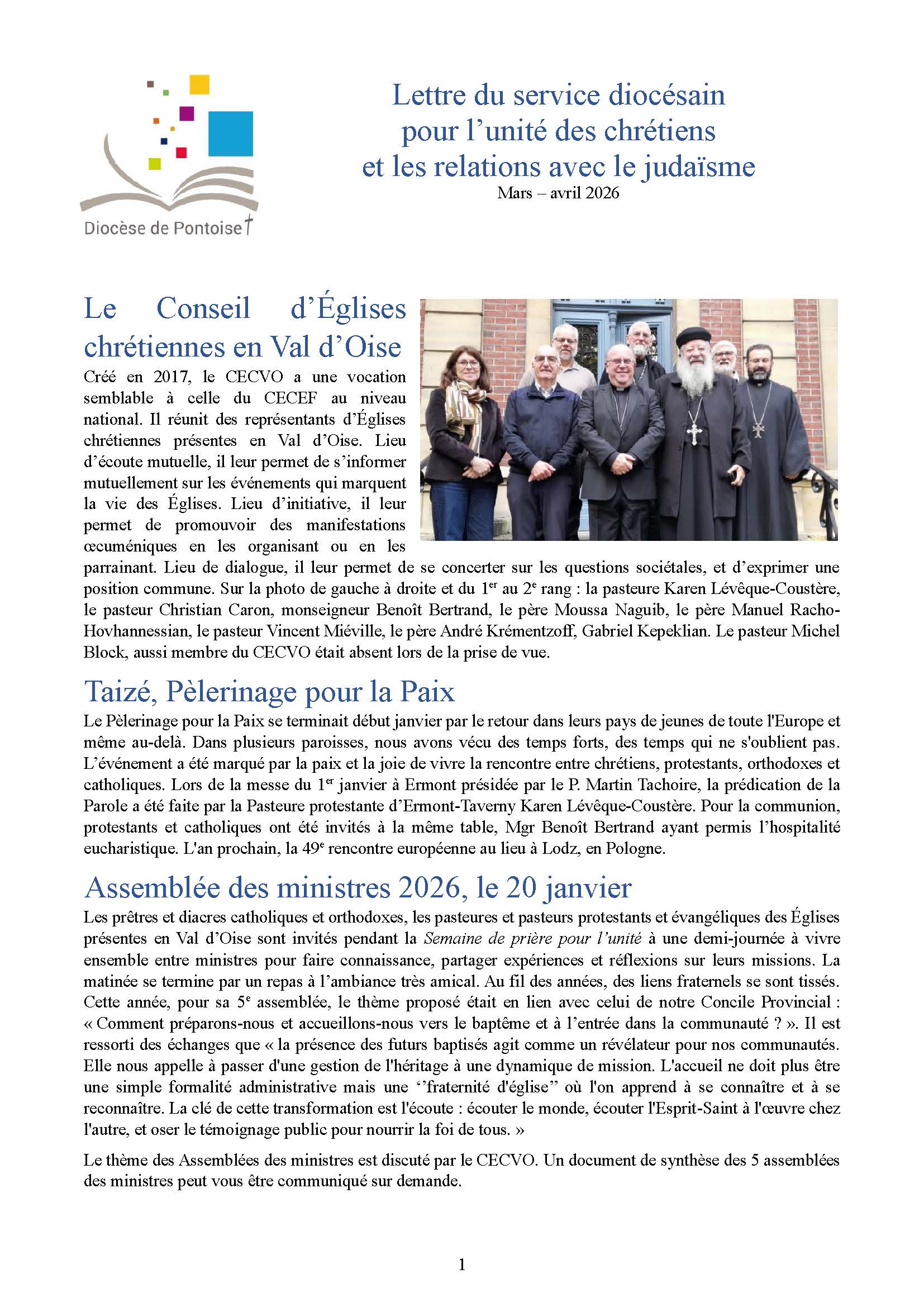 L’Assemblée des Ministres du Val-d’Oise réunit les prêtres, les pasteurs, les ministres des différentes Eglises chrétienne du Val-d’Oise (catholiques, protestants, orthodoxes). La 5e assemblée a lieu le mardi 20 janvier 2026, de 9h30 à 14h30 à Taverny sur le thème : « Comment préparons-nous et accompagnons-nous nos catéchumènes vers le baptême et leur entrée dans la communauté ? »