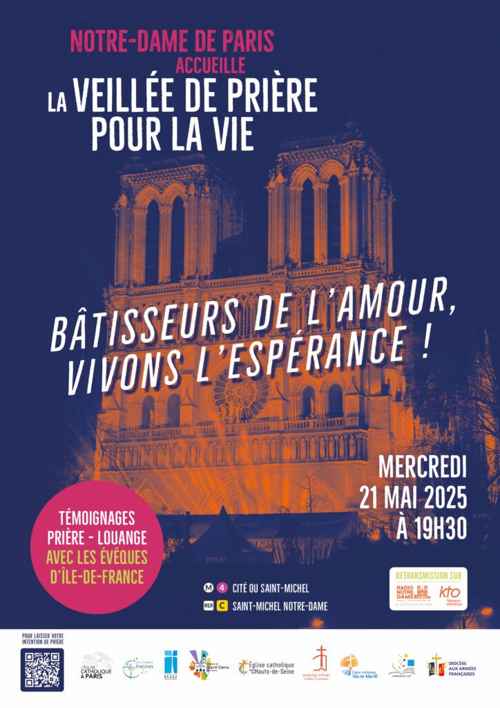A l’invitation des évêques d’Ile-de-France, la Veillée de prière pour la vie 2025 aura lieu le mercredi 21 mai 2025 à 19h30 à la cathédrale Notre-Dame de Paris, sur le thème « Bâtisseurs de l’amour, vivons l’espérance ! »